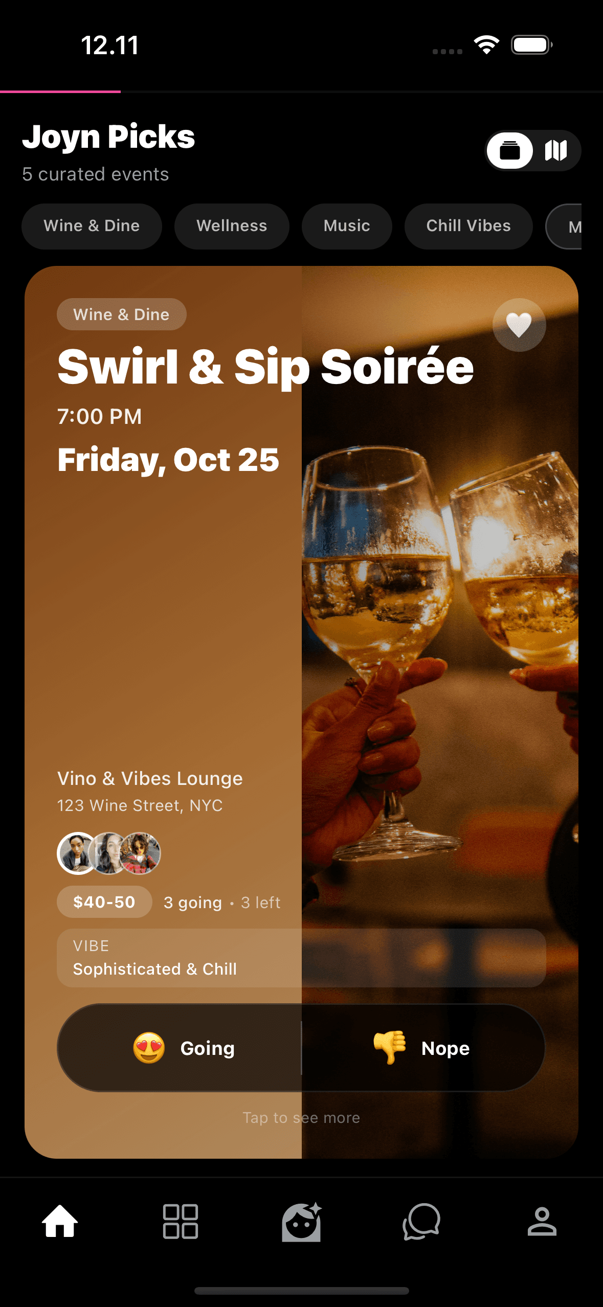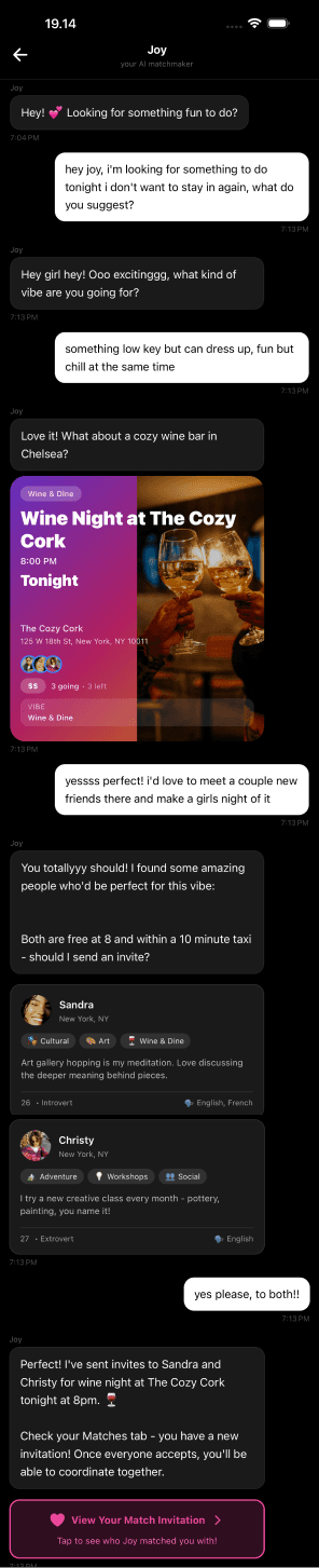 Easily create a plan, set the vibe, Joyn will match & invite new compatible people.